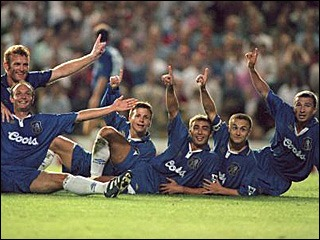 With 85 minutes gone, Di Matteo, making his home debut, receives the ball about thirty yards from goal, dead centre, one defender in front, one fast approaching behind. With calm assurance, the Italian works an inch of space and rockets a drive into the bottom left corner. An excellent, pinpoint finish, but that’s only half the story. In the resulting frenzy, Di Matteo lies nonchalantly on the grass with his left arm pointing up at the sky. Captain Dennis Wise follows his example, as do Jody Morris and Dan Petrescu. Leboeuf throws himself down next to them, limbs spread like a starfish, and defensive partner Erland Johnsen crouches behind him, again with that left hand pointing. It was a team celebration like no other; the revolution had begun. Two months later, Gullit signed Gianfranco Zola. The rest is history.